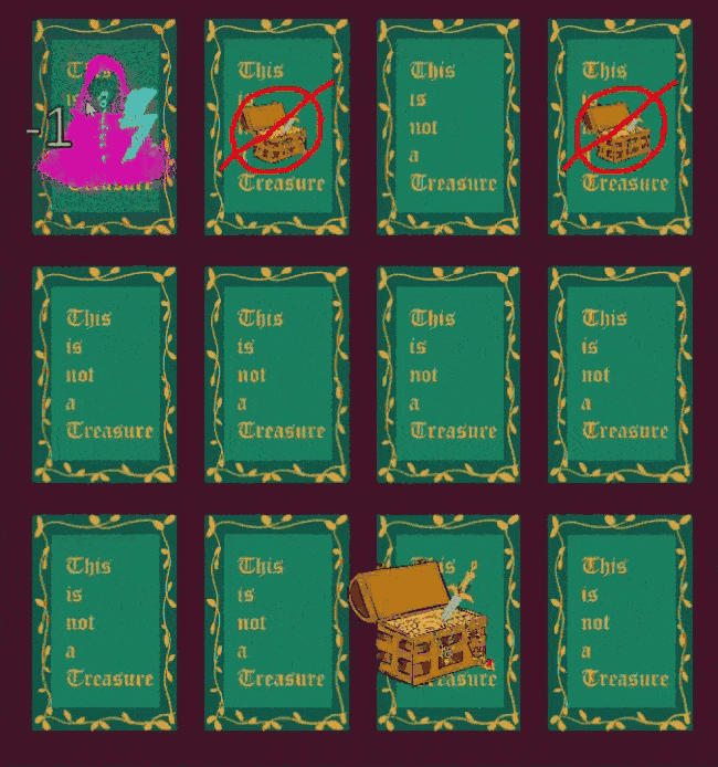This is not a Treasure is a card-based dungeon crawler where you chase a treasure that moves like a chess knight. Each room offers different effects, some of which can assist in capturing the treasure. Navigate, strategize, and corner the elusive treasure before it escapes.